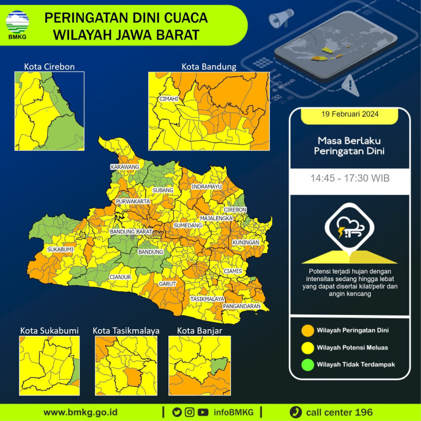 Warga diminta untuk memperhatikan peringatan dini dari BMKG terkait potensi hujan yang dapat disertai kilat/petir dan angin kencang. Peringatan ini berlaku untuk sebagian wilayah Jawa Barat mulai dari Kabupaten Kuningan, Ciamis, Bandung Barat, Cimahi, Bandung, Cianjur, Tasikmalaya, Subang, Purwakarta, hingga Bogor, Depok, Bekasi, Karawang, Sukabumi, Indramayu, Sumedang, Garut, Cirebon, Pangandaran, dan Banjar.